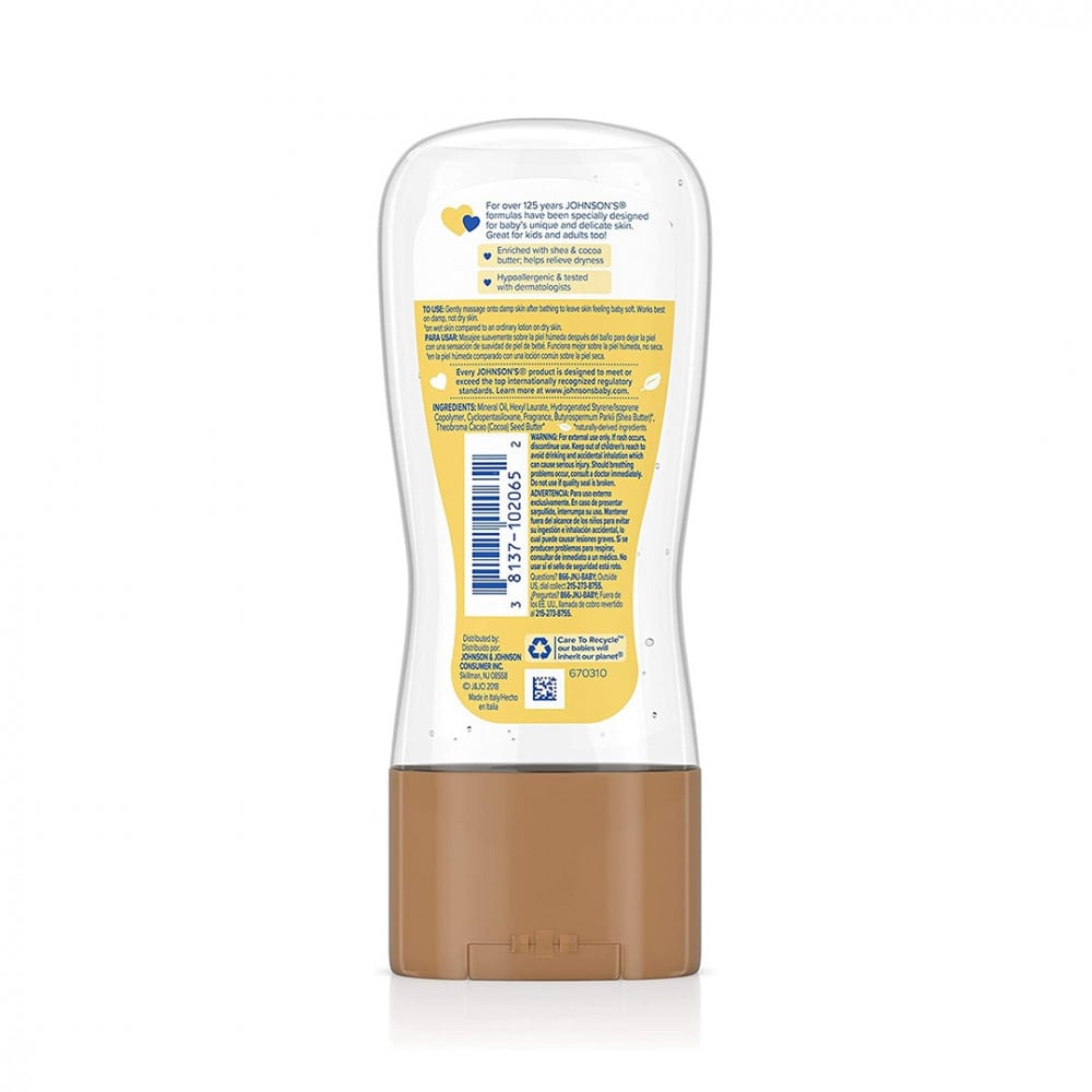 - يعمل جل زيت الأطفال من جونسون مع زبدة الشيا والكاكاو على الاحتفاظ بما يصل إلى 10 مرات من الرطوبة على البشرة الرطبة أكثر من اللوشن العادي على البشرة الجافة.