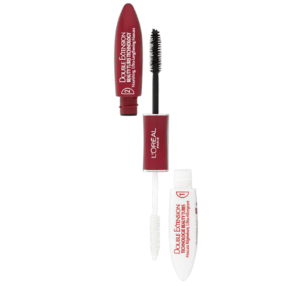 تحتوي ماسكرا دبل اكستنشن من لوريال باريس على فرشتين حيث تحتوي الفرشة الاولى على طبقة بيضاء تتكون من سيراميد ار الذي يحتوي على الياف طبيعية حيث تقوم باعطاء رموشك مظهر اطول، بينما تحتوي الفرشاة الثانية على المسكرة التي سوف تقوم باعطاءك رموش اكثر كثافة بلون اسود عميق
