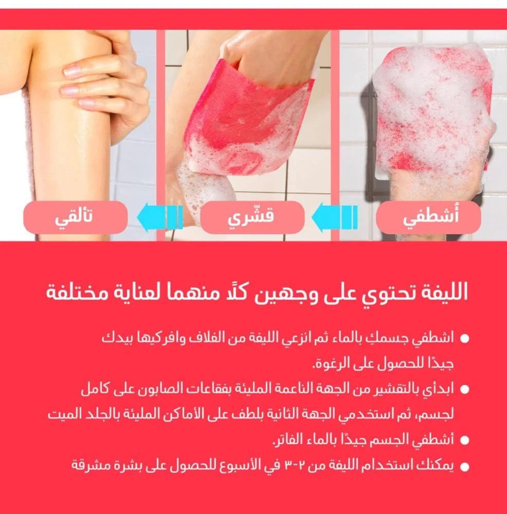 صُممت هذه الليفة لإمكانية الاستخدام من الوجهين، جهة بيضاء لكافة مناطق الجسم غنية بالرغوة ذات المكونات الفعّالة، وجهة لتقشير مكثف لونها أحمر للمرفقين والكاحل مصممة لإزالة خلايا الجلد الميت القديمة،