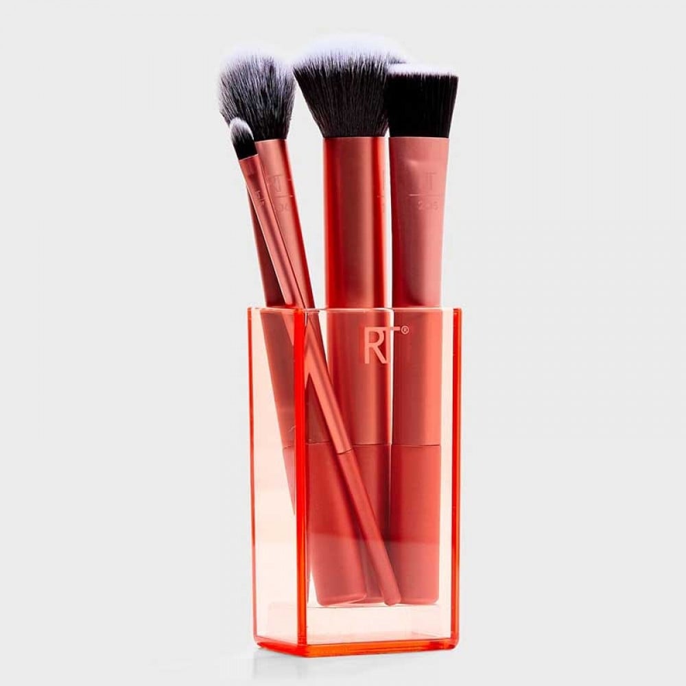 مجموعة الفرش الأساسية من ريل تكنيك، مجموعة احترافية تحتوي على 4 فرش مكياج أساسية، وقاعده لتنظيم الفرش.