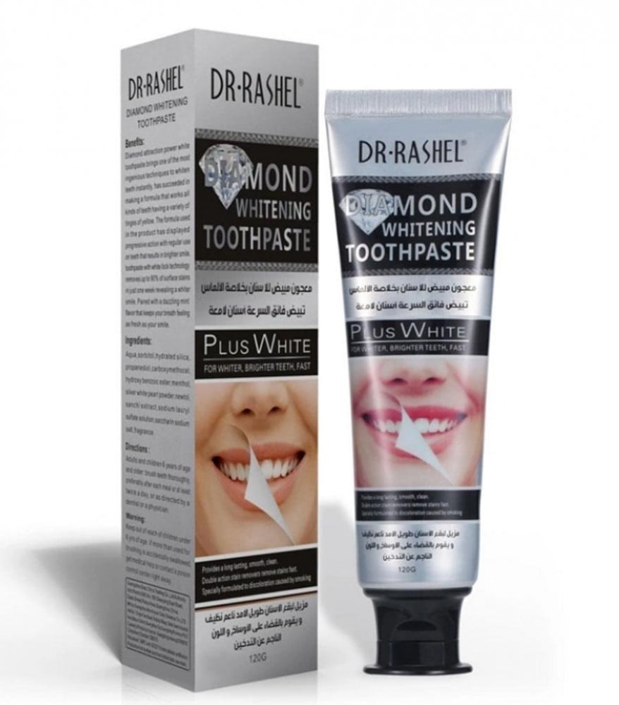 العلامة التجارية DR.RASHEL وظيفة تبييض إزالة البقع ، نفسا منتعشا ميزات معجون الأسنان الأبيض يجلب الماس واحدة من أكثر التقنيات براعة لتبييض الأسنان على الفور ، وقد نجح في صنع تركيبة تعمل على جميع أنواع الأسنان التي تحتوي على مجموعة متنوعة من الصبغات من الأصفر. أظهرت الصيغة المستخدمة في المنتج تأثيرًا تدريجيًا مع الاستخدام المنتظم للأسنان مما ينتج عنه ابتسامة أكثر إشراقًا. يزيل معجون الأسنان بتقنية القفل الأبيض ما يصل إلى 90٪ من بقع السطح في أسبوع واحد فقط ليكشف عن ابتسامة أكثر بياضًا. مع نكهة النعناع المبهرة التي تحافظ على أنفاسك منتعشة مثل ابتسامتك المكونات الرئيسية أكوا ، سوربيتول ، سيليكا رطبة ، بروبانديول ، كاربوكسي ميثوسيل ، هيدروكسي بنزويك استر ، مينثول ، صبغة لؤلؤية ذهبية ، نيوتول ، مستخلص سانشي ،