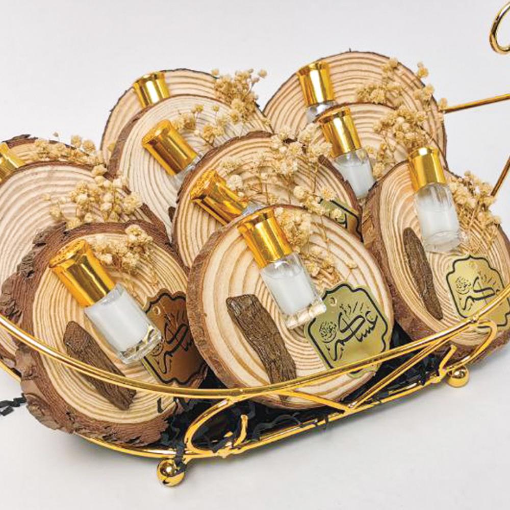 توزيعات مسك مع كسرة بخور على قطعة خشبية 10 قطع مع ستاند ذهبي راقي يعطي مظهر جميل للتوزيعات