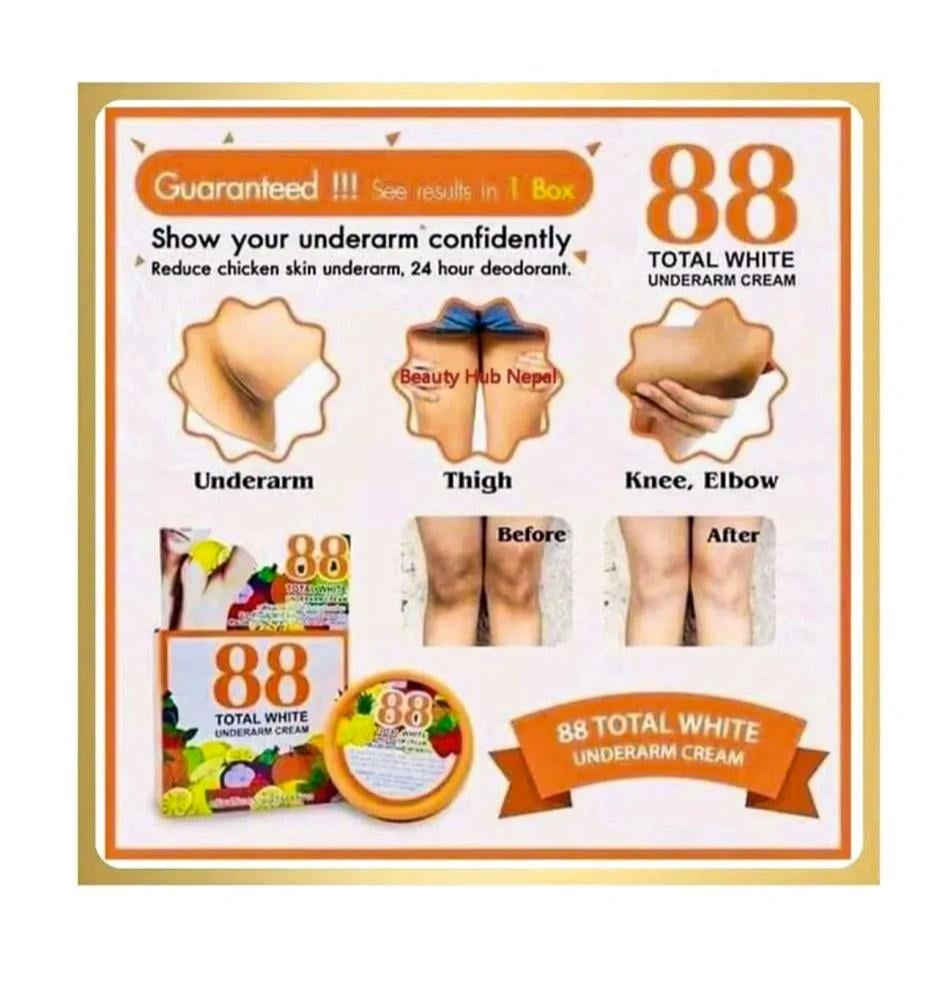 كريم 88 توتال وايت لتفتيح تحت الابط هو منتج مصمم لتفتيح وتوحيد لون بشرة تحت الإبط والمناطق الحساسة الأخرى مثل الركبتين والمرفقين والفخذين. يتميز الكريم بتركيبة فعّالة وغنية بالمكونات الطبيعية التي تعمل على تقليل التصبغات الداكنة وتجديد خلايا البشرة للحصول على نعومة وإشراقة ملحوظة.