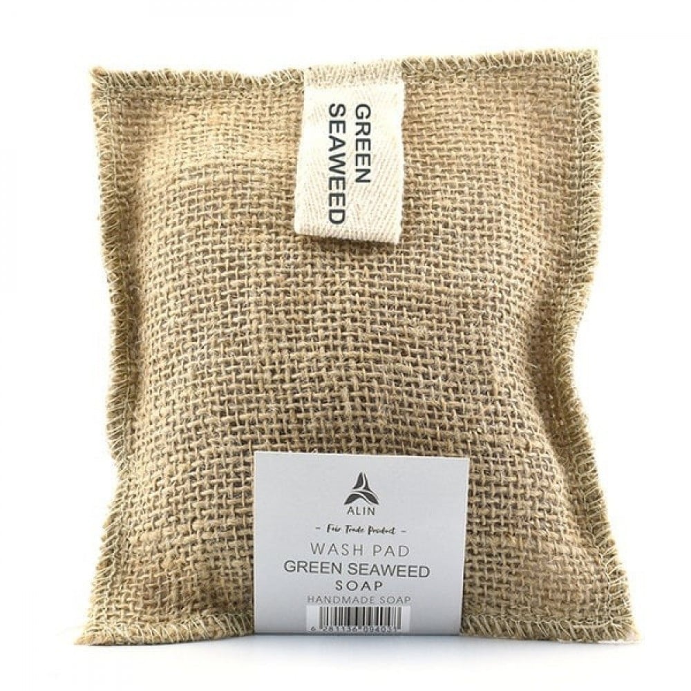 صابون طبيعي يدوي مدمج مع ليفة لتقشير البشرة بخلاصة اعشاب البحر الخضراء.