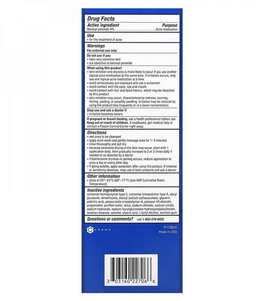 - طريقة الاستخدام: تُبلل المنطقة المراد تنظيفها. يُوضع غسول حب الشباب ويُدلك بلطف لمدة دقيقة إلى دقيقتين. يُشطف الوجه جيدًا ويُجفف بالتربيت.